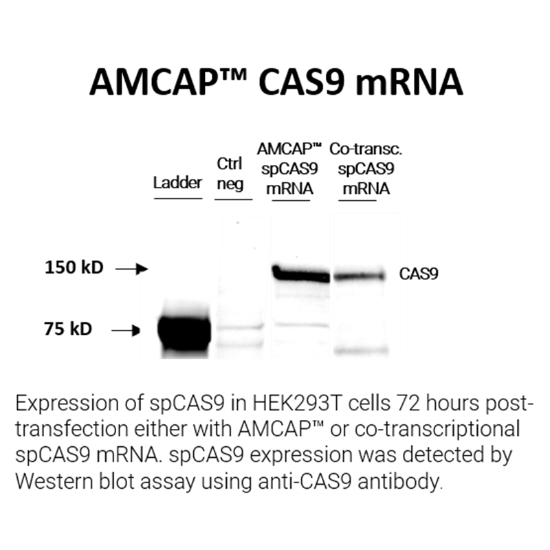 AMCAP ™ Cas9 mRNA expresses the Cas9 protein, a crucial component of the CRISPR-Cas9 gene editing system. Cas9 is an RNA-guided DNA endonuclease that can be programmed to target specific DNA sequences.